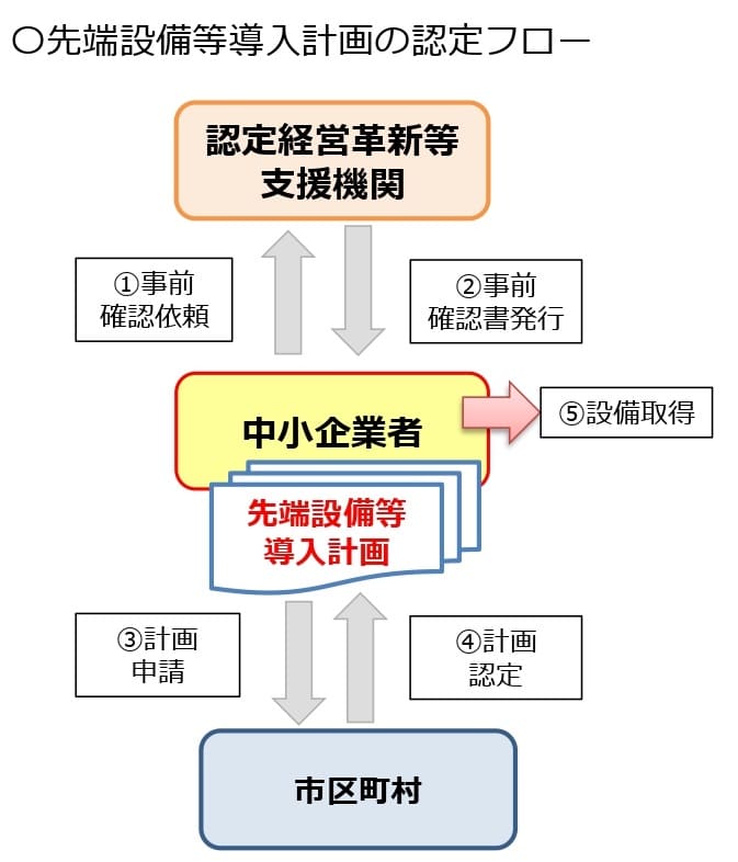 - ① 中小事業者は認定経営革新等支援機関へ先端設備等導入計画の事前確認を依頼します。