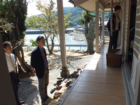 | 蛤浜を訪れた一行 | 頭ヶ島天主堂で説明を受ける一行 |