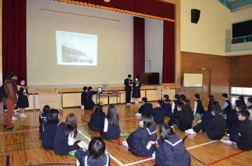 そのあと、奈良尾中学校の三年生と体育館で交流。班別に自己紹介を行った後、奈良尾中学校について紹介がなされ、イス取りゲームや歌などで互いの交流を深めると会場はにぎやかな笑い声に包まれました。別れるときには、連絡先を交換し合い、写真を撮り合う姿があちらこちらに見られました。